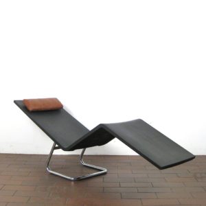 Fauteuil et repose pied en simili cuir noir et acier chromé.