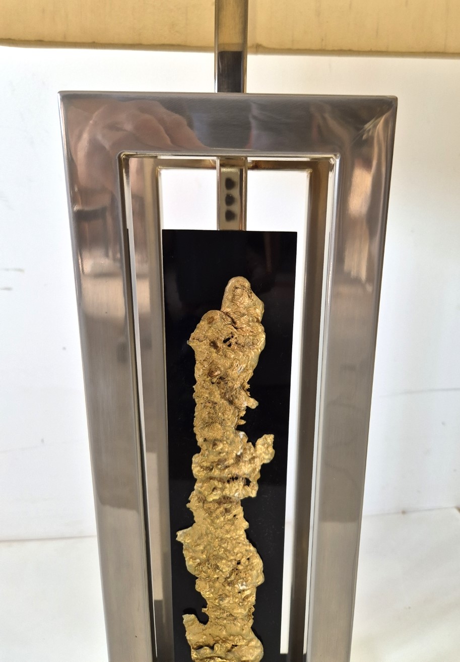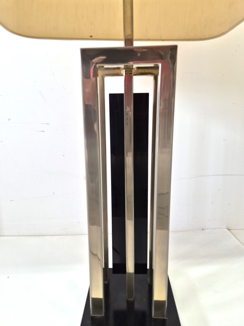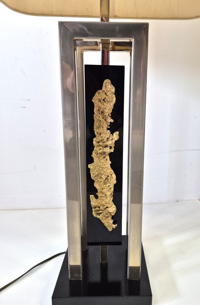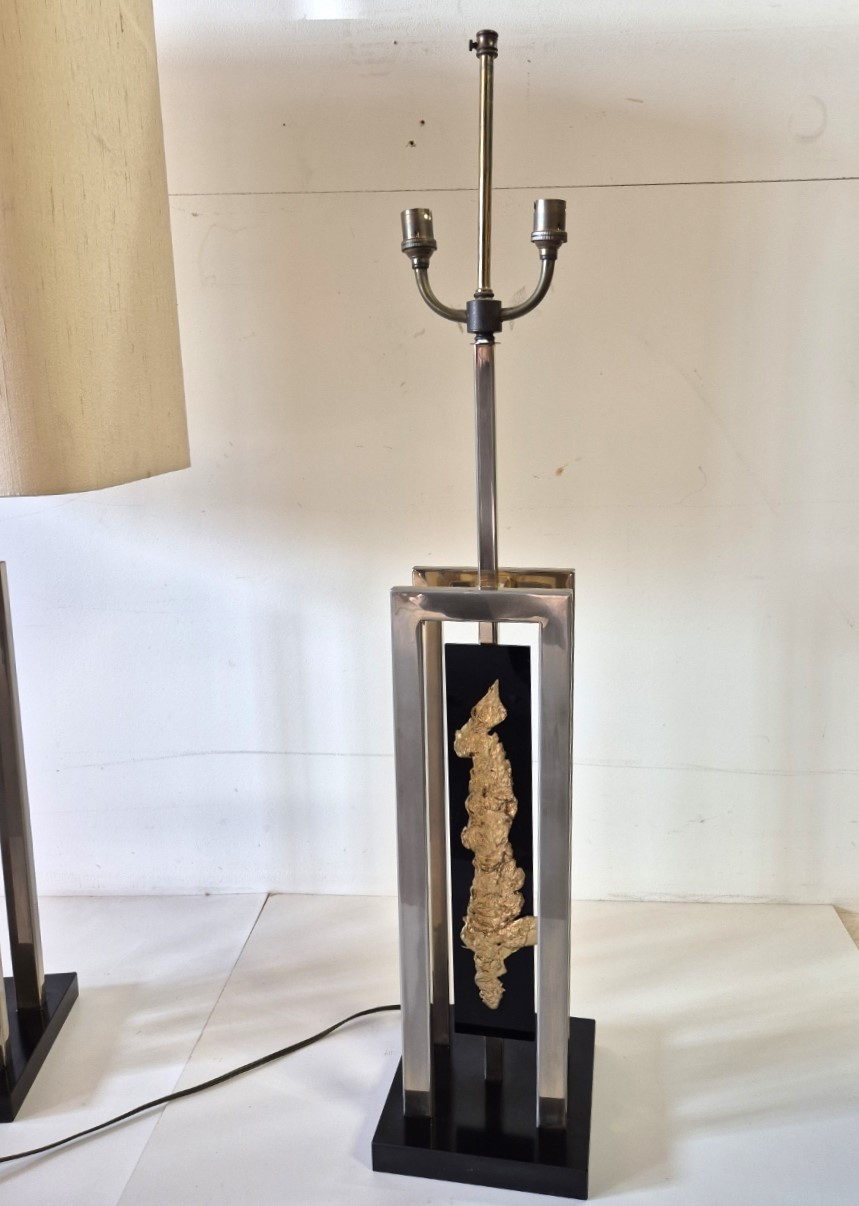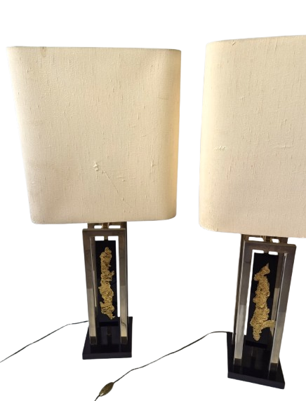 Importante et spectaculaire paire de lampes, Philippe Cheverny vers 1970. Structure géométrique en métal ornée d’une compression en métal doré montée sur plexiglas noir, l’ensemble surmonté par un grand abat-jour d’origine monté sur un axe télescopique dont la hauteur est réglable de 90cm à 1m13. 2 ampoules à baïonnettes par lampe, câbles et interrupteurs d’origine. Usures sur la structure et sur les abat-jours. Dimensions des abats jours 43 x 29 x hauteur 45cm.