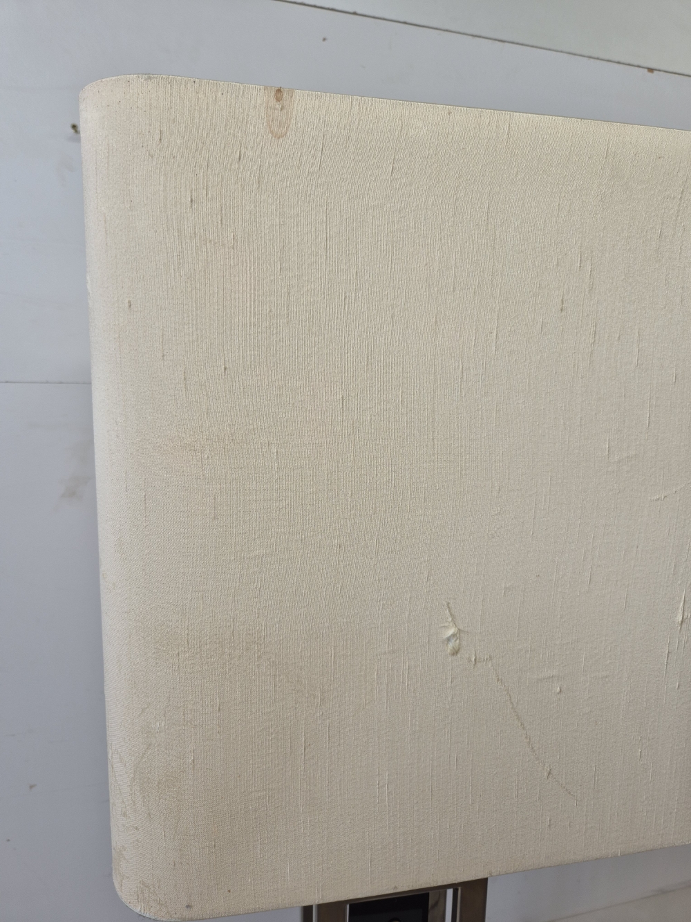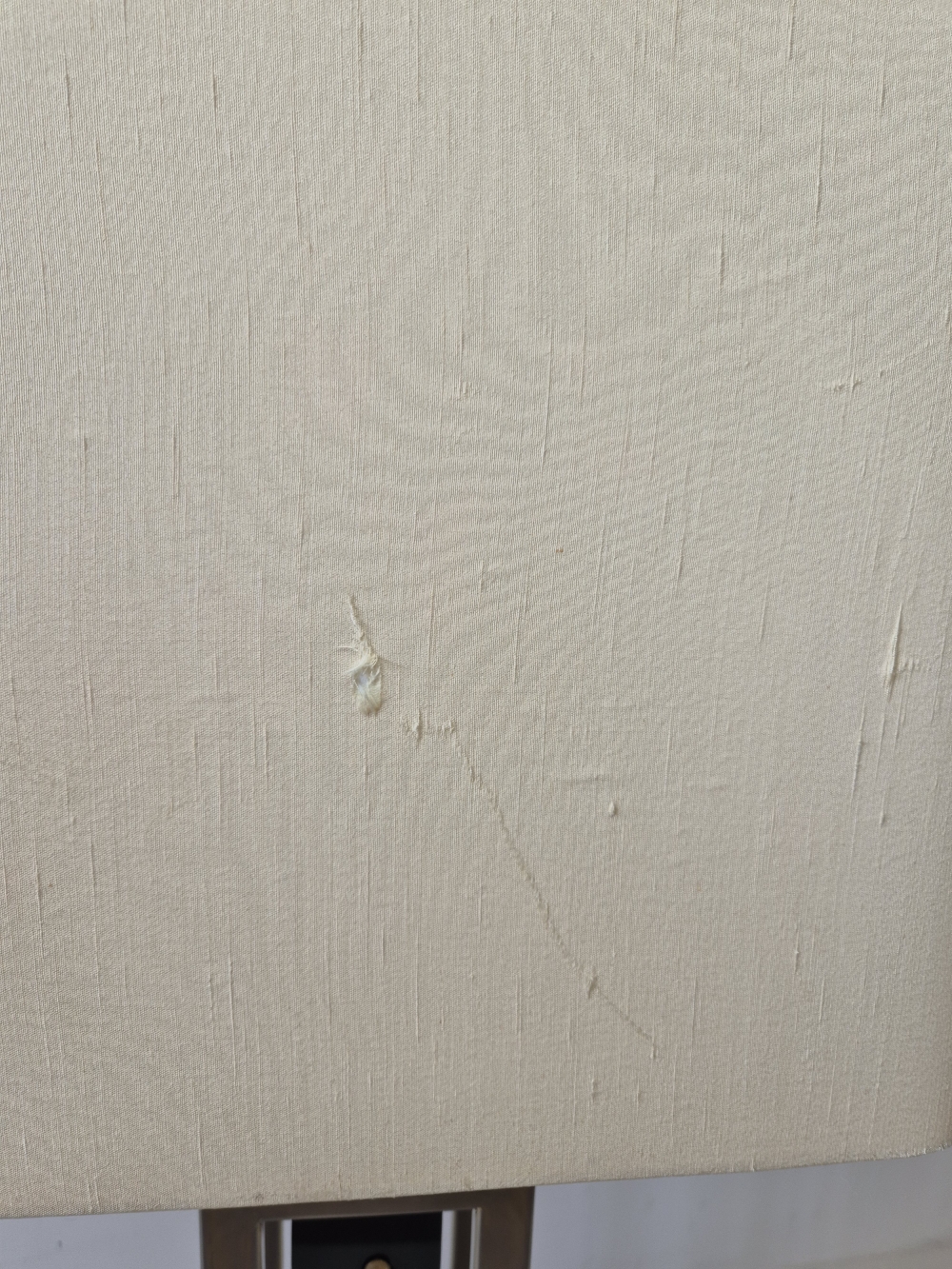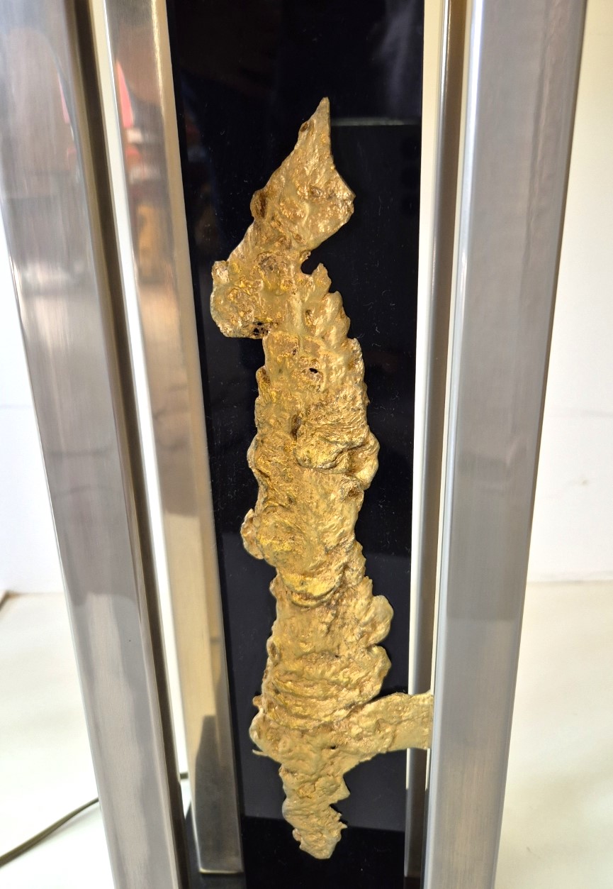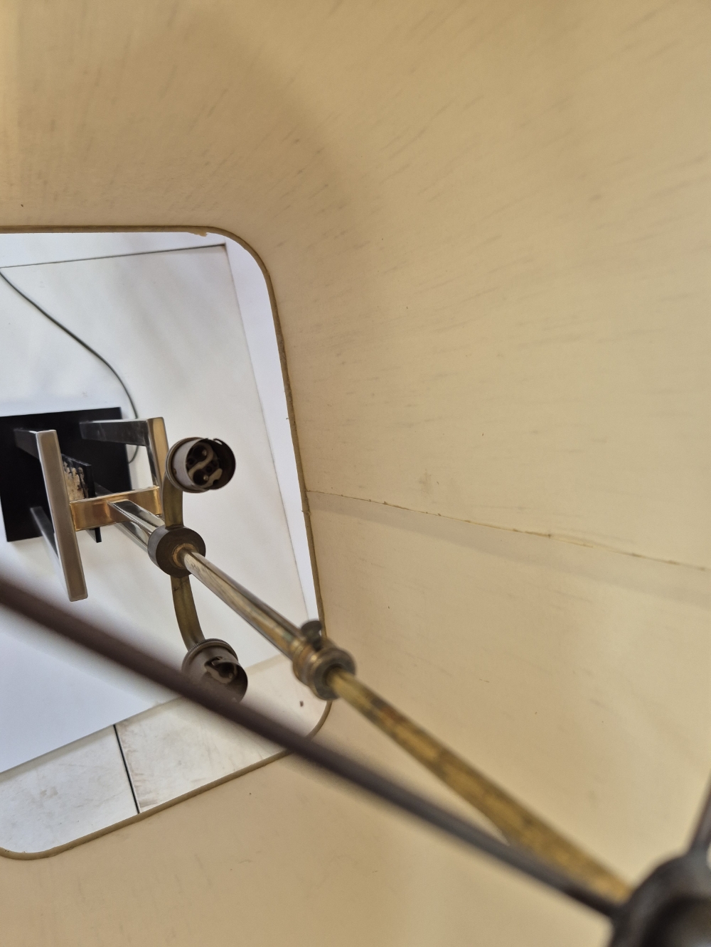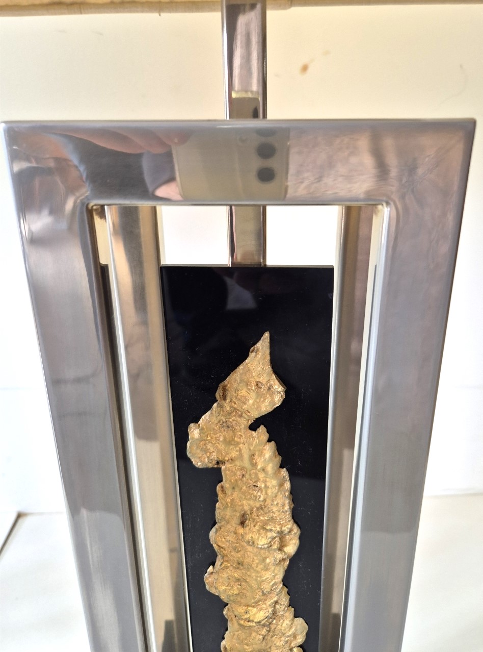 Importante et spectaculaire paire de lampes, Philippe Cheverny vers 1970. Structure géométrique en métal ornée d’une compression en métal doré montée sur plexiglas noir, l’ensemble surmonté par un grand abat-jour d’origine monté sur un axe télescopique dont la hauteur est réglable de 90cm à 1m13. 2 ampoules à baïonnettes par lampe, câbles et interrupteurs d’origine. Usures sur la structure et sur les abat-jours. Dimensions des abats jours 43 x 29 x hauteur 45cm.