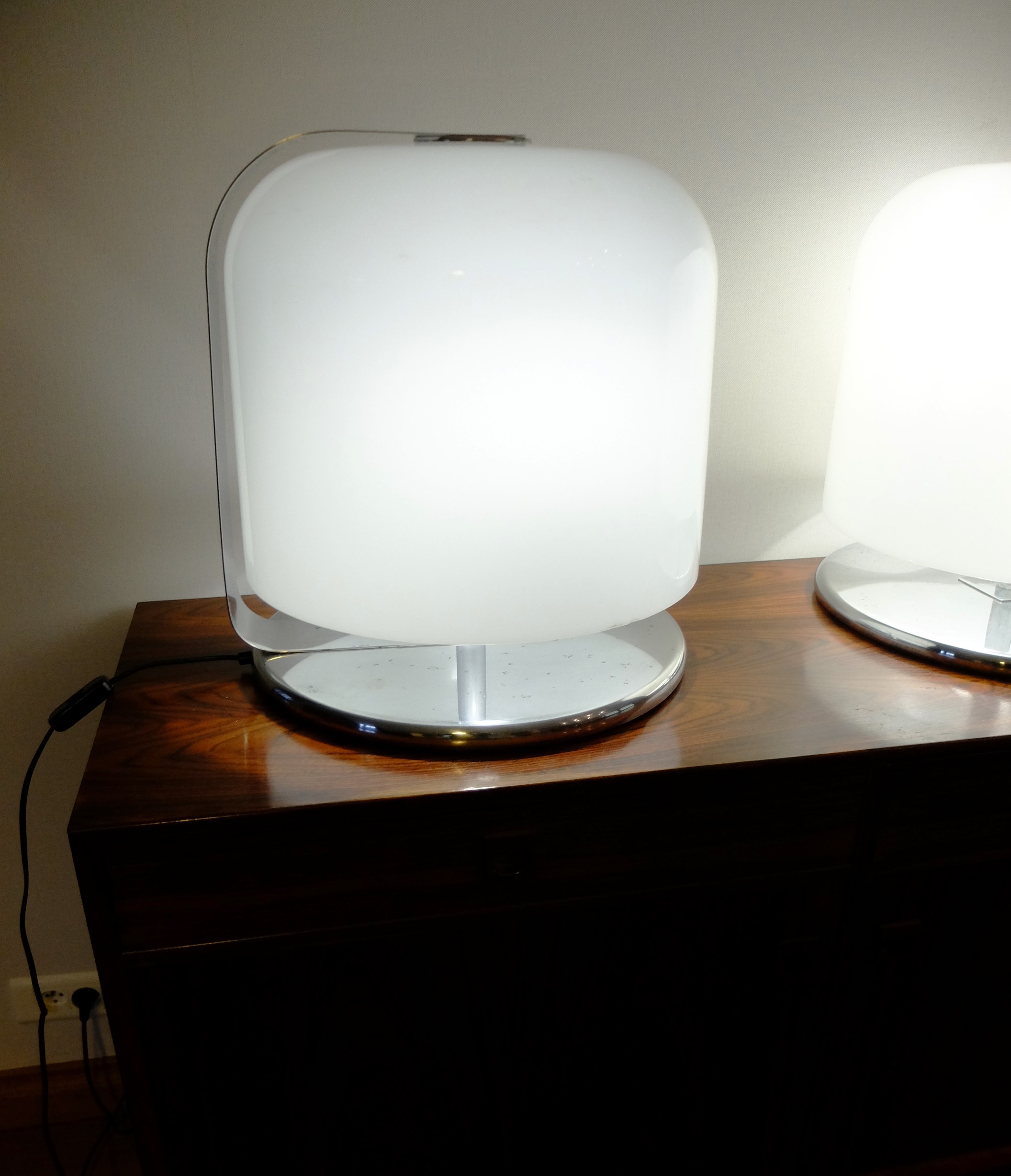 Grande paire de lampes de table. Base ronde en métal chromé supportant un méplat arqué retenant une importante cloche en ABS opalin