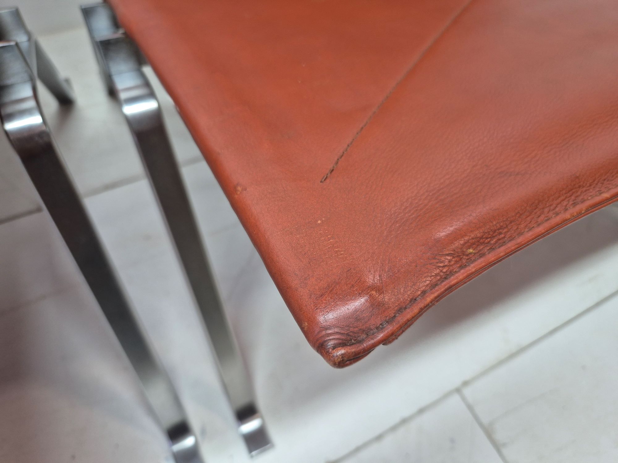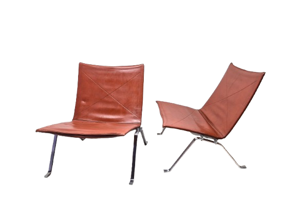 Poul Kjaerholm (1929-1980) Paire de chauffeuses modèle PK22 Cuir et acier, marque d’usages et d’usures, pas de déchirures. Édition Kold Christensen Modèle créé en 1957 H 71×L 63×P 67 cm La chaise PK 22 est l’une des icônes du design moderniste scandinave, elle possède une ligne élancée, minimaliste et élégante. Celle-ci est une des créations phare du designer Poul Kjerholm, elle assura définitivement sa renommée grâce à son succès commercial immédiat et la à reconnaissance des professionnels du design. Elle est récompensée du Grand Prix de la Triennale de Milan en 1957.